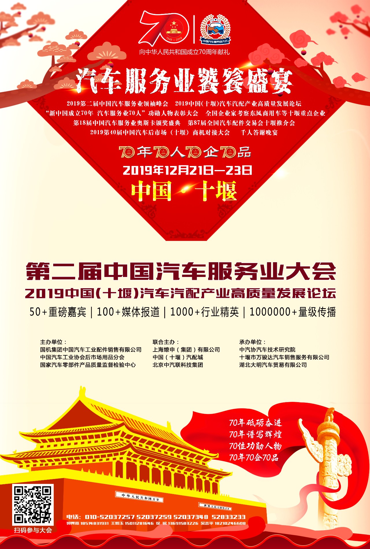 2019第二屆中國(guó)汽車(chē)服務(wù)業(yè)大會(huì)將包括“中國(guó)(十堰)汽車(chē)汽配產(chǎn)業(yè)高質(zhì)量發(fā)展論壇”、“中國(guó)汽車(chē)服務(wù)業(yè)領(lǐng)袖峰會(huì)”、“新中國(guó)成立70年 汽車(chē)服務(wù)業(yè)70人”功勛人物表彰大會(huì)、“第18屆中國(guó)汽車(chē)服務(wù)業(yè)奧斯卡頒獎(jiǎng)盛典”、“十堰汽車(chē)汽配產(chǎn)業(yè)招商推介會(huì)”、“全國(guó)企業(yè)家考察東風(fēng)商用車(chē)主機(jī)廠等十堰重點(diǎn)企業(yè)”、“第87屆全國(guó)汽車(chē)配件交易會(huì)十堰推介會(huì)”及“中國(guó)汽車(chē)服務(wù)業(yè)大會(huì)千人晚宴”等活動(dòng),并將集中表彰汽車(chē)行業(yè)在發(fā)展歷程中做出貢獻(xiàn)的功勛人物,向中華人民共和國(guó)成立70周年獻(xiàn)禮!