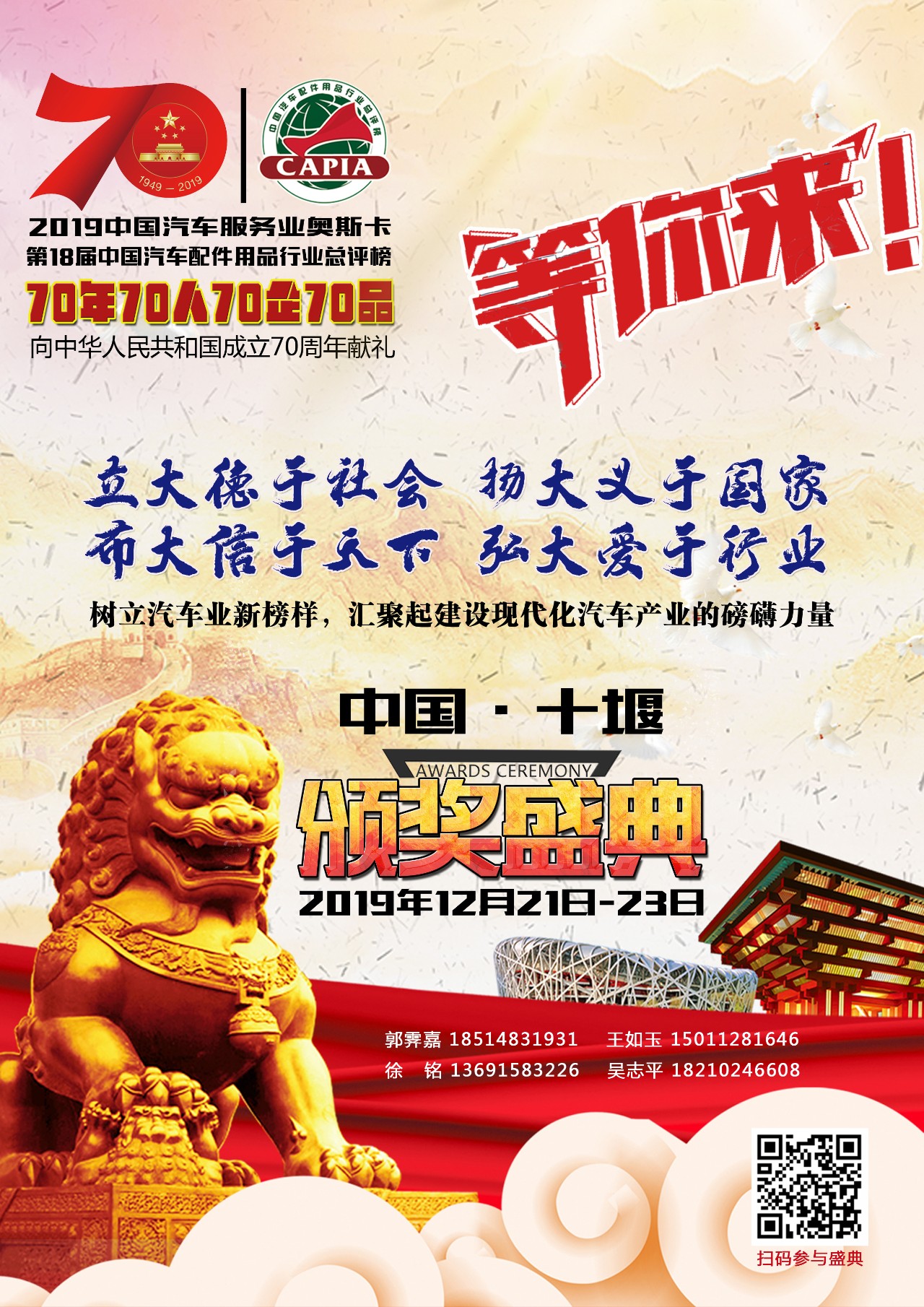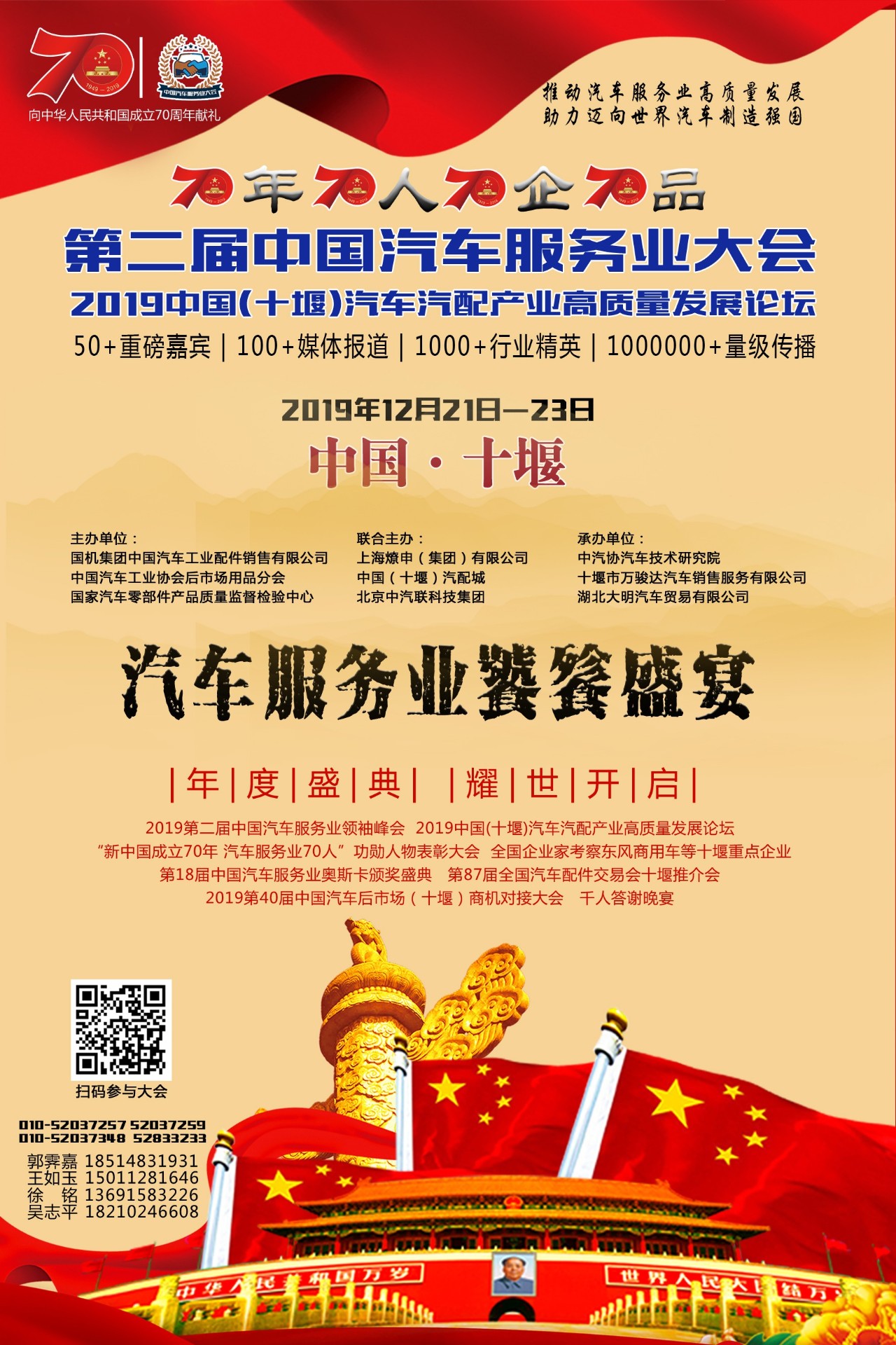 不忘初心,牢記使命。為貫徹落實(shí)黨的十九大精神,認(rèn)真貫徹落實(shí)《國(guó)務(wù)院辦公廳關(guān)于加快發(fā)展流通促進(jìn)商業(yè)消費(fèi)的意見(jiàn)》(國(guó)辦發(fā)〔2019〕42號(hào))和《關(guān)于隆重慶祝中華人民共和國(guó)成立70周年廣泛組織開(kāi)展“我和我的祖國(guó)”群眾性主題宣傳教育活動(dòng)的通知》的相關(guān)要求,激發(fā)和保護(hù)企業(yè)家精神,壯大企業(yè)家隊(duì)伍,增強(qiáng)企業(yè)家信心,進(jìn)一步推動(dòng)經(jīng)濟(jì)新常態(tài)下汽車(chē)企業(yè)加快發(fā)展方式轉(zhuǎn)變,實(shí)現(xiàn)高質(zhì)量發(fā)展,舉辦一堂中汽聯(lián)“特殊黨課”,擬在十堰市人民政府支持下,由中國(guó)汽車(chē)工業(yè)協(xié)會(huì)后市場(chǎng)用品分會(huì)、國(guó)機(jī)集團(tuán)中國(guó)汽車(chē)工業(yè)配件銷(xiāo)售有限公司、國(guó)家汽車(chē)零部件產(chǎn)品質(zhì)量監(jiān)督檢驗(yàn)中心等機(jī)構(gòu)主辦的以“新時(shí)代、新格局、新使命”為主題的2019第二屆中國(guó)汽車(chē)服務(wù)業(yè)大會(huì)暨中國(guó)(十堰)汽車(chē)汽配產(chǎn)業(yè)高質(zhì)量發(fā)展論壇將于2019年12月21-23日在中國(guó)商用車(chē)之都、道教圣地湖北十堰市盛大舉行。
