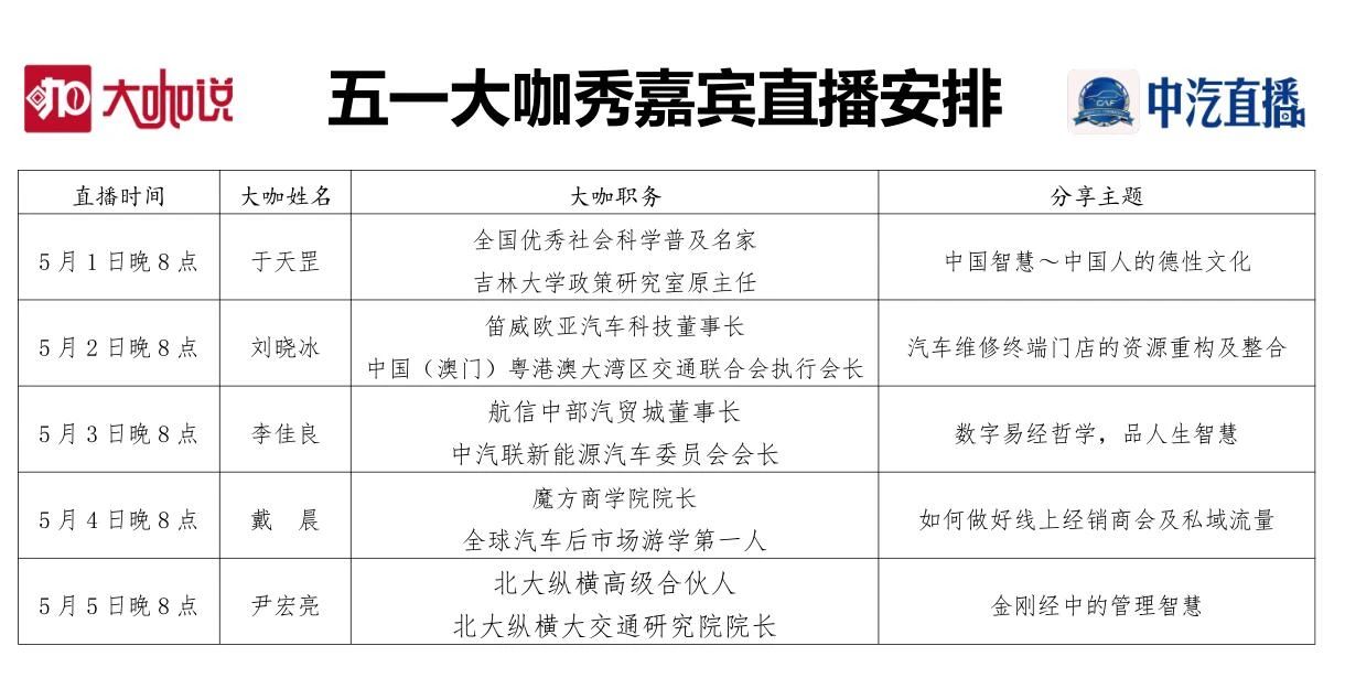 今年五一期間,中汽直播《大咖說(shuō)》隆重推出“五一大咖秀”(1號(hào)-5號(hào)),每天邀請(qǐng)一位行業(yè)大咖,每晚8點(diǎn)在中汽聯(lián)直播間分享成功經(jīng)驗(yàn)及創(chuàng)富故事,傳授獨(dú)有的專業(yè)知識(shí),旨在用有溫度的影像,傳遞創(chuàng)富智慧,展示最真實(shí)的時(shí)代創(chuàng)富精神。