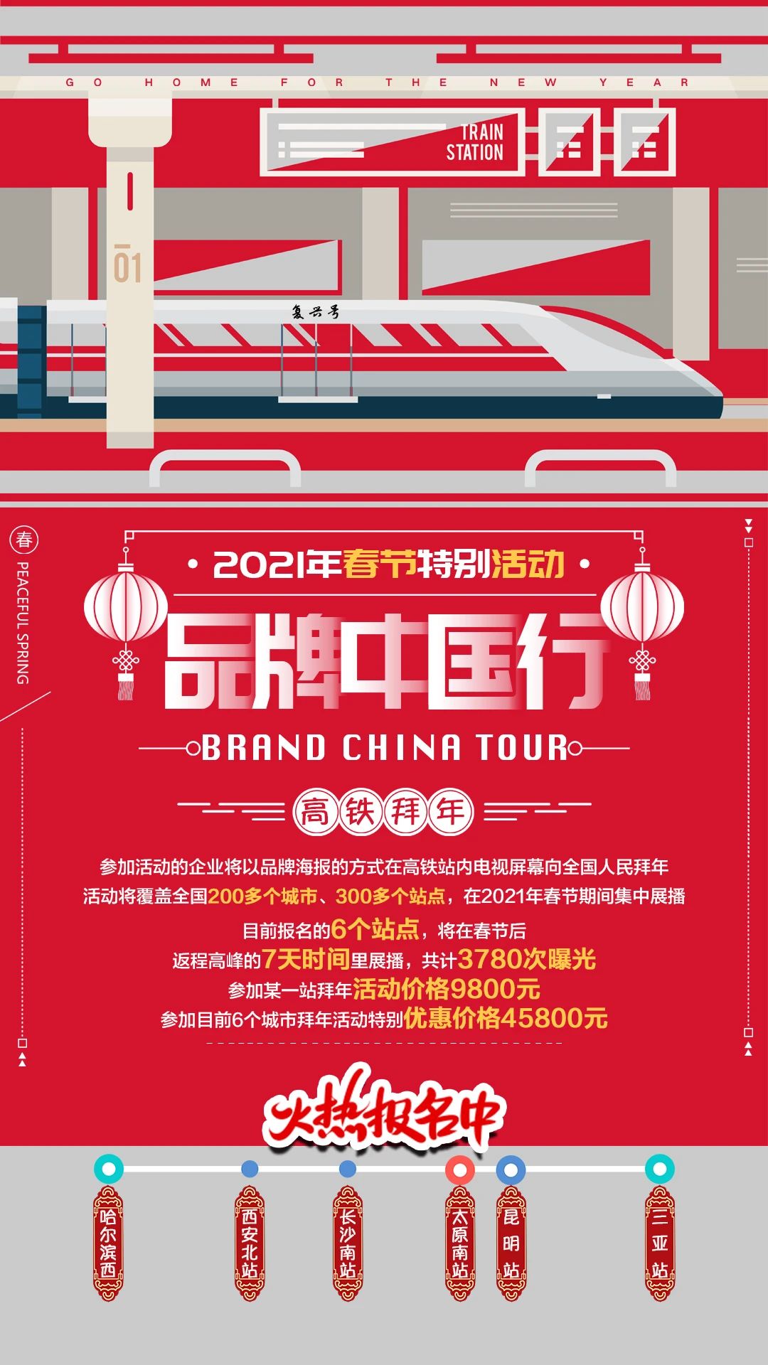 哈爾濱西、西安北站、長沙南站、太原南站、昆明站、三亞站為中汽聯(lián)特別推薦站點(diǎn),5秒7天每天90次展播,總計(jì)3780次曝光,單站市場價(jià)18000元,中汽聯(lián)特惠價(jià)9800元,6站聯(lián)播僅需45800元,名