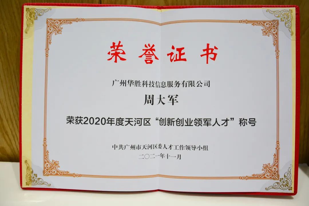 通過層層選拔和激烈的角逐,華勝集團總裁周大軍從眾多人才中脫穎而出,成為本次“天河區(qū)2020年度創(chuàng)新創(chuàng)業(yè)領(lǐng)軍人才獎”獲得者之一。一同獲得此大獎殊榮的還有廣州酷狗計算機科技有限公司、廣州趣丸網(wǎng)絡(luò)科技有限公司、華南理工大學建筑設(shè)計研究院有限公司等其它領(lǐng)域中的佼佼者。