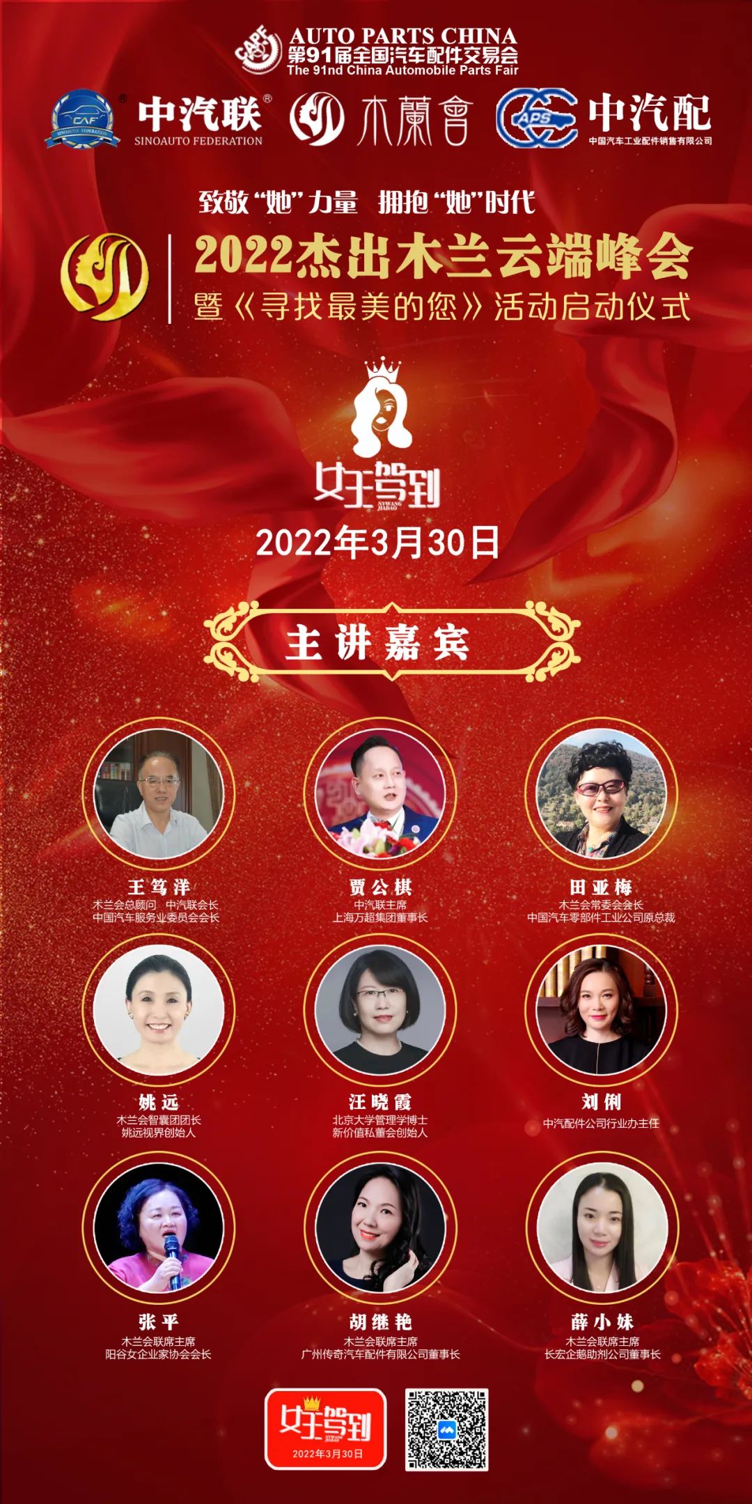 為表彰先進(jìn),樹立榜樣,充分發(fā)揮先進(jìn)典型和模范人物教育人、鼓舞人、引領(lǐng)人的重要作用,大力營造崇尚英雄、學(xué)習(xí)模范、爭當(dāng)先進(jìn)的濃厚氛圍,用“干一行愛一行” 的執(zhí)著,成就“鉆一行精一行”的精彩譜寫木蘭新時代的壯麗篇章。在中國汽車工業(yè)配件銷售有限公司第91屆全國汽車配件交易會的支持下,中汽聯(lián)決定于3月30日盛大舉行“2022杰出木蘭云端峰會暨《尋找最美的您》系列活動啟動儀式”,以“致敬‘她’力量 擁抱‘她’時代”為主題,以自己的親身經(jīng)歷分享創(chuàng)業(yè)歷程、私享人生感悟、碰撞商業(yè)智慧、品味人生精髓,昂揚(yáng)創(chuàng)新精神,倡揚(yáng)文明新風(fēng),走在時代前列,以奔跑奮進(jìn)的姿態(tài),在推進(jìn)中華民族偉大復(fù)興中國夢中譜寫木蘭“半邊天”的壯麗詩篇,以木蘭特殊的方式、優(yōu)異的成績迎接黨的二十大勝利召開,助推中國汽車產(chǎn)業(yè)高質(zhì)量發(fā)展!