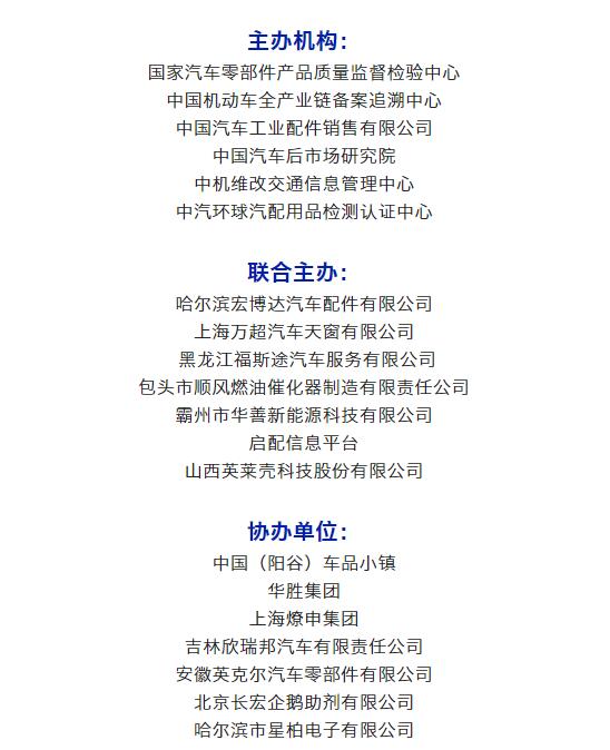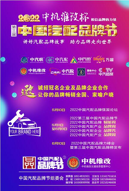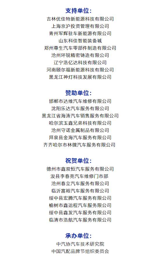 2022中機(jī)維改杯中國(guó)汽配品牌節(jié)由中汽聯(lián)、中汽配、中機(jī)維改共同主辦;哈爾濱宏博達(dá)汽車(chē)配件有限公司、上海萬(wàn)超汽車(chē)天窗有限公司、 黑龍江福斯途汽車(chē)服務(wù)有限公司、包頭市順風(fēng)燃油催化器制造有限責(zé)任公司、霸州市華善新能源科技有限公司、啟配信息平臺(tái)、山西英萊殼科技股份有限公司聯(lián)合主辦;由中國(guó)(陽(yáng)谷)車(chē)品小鎮(zhèn)、華勝集團(tuán)、上海燎申集團(tuán)、吉林欣瑞邦汽車(chē)有限責(zé)任公司、安徽英克爾汽車(chē)零部件有限公司、北京長(zhǎng)宏企鵝助劑有限公司、哈爾濱市星柏電子有限公司友情協(xié)辦;由吉林優(yōu)佳特新能源科技有限公司、上海京滬投資管理有限公司、青州軍輝駐車(chē)新能源有限公司、山東科佳智能裝備城、鄭州尊生汽車(chē)零部件制造有限公司、滄州環(huán)銳精密鑄造有限公司、遼寧浩億達(dá)科技有限公司、河南頤爾福新能源科技有限公司、黑龍江神燈科技發(fā)展有限公司特別支持;邯鄲市達(dá)維汽車(chē)維修有限公司、沈陽(yáng)樂(lè)達(dá)汽車(chē)服務(wù)有限公司、黑龍江省海濤汽車(chē)銷(xiāo)售服務(wù)有限公司、哈爾濱玉鑫兄弟科技有限公司、滄州守諾金屬制品有限公司、拜泉縣金海汽車(chē)服務(wù)有限公司、齊齊哈爾市林微汽車(chē)服務(wù)有限公司友情贊助;由德州市鑫雙恒汽車(chē)服務(wù)有限公司、浚縣李春亮汽車(chē)維修門(mén)市部 、滄州春立汽車(chē)服務(wù)有限公司、臨沂富裕汽車(chē)服務(wù)有限公司、綏中縣宏騰汽車(chē)服務(wù)有限公司、榆樹(shù)市鑫運(yùn)程汽車(chē)服務(wù)限公司、綏中縣鑫發(fā)汽車(chē)服務(wù)有限公司、臨清市浩航汽車(chē)服務(wù)有限公司特別祝賀。