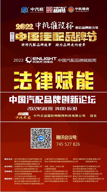 2022年5月17號(hào)下午2點(diǎn),相約“法律賦能 · 2022 中國(guó)汽配品牌創(chuàng)新論壇”,由中汽云監(jiān)國(guó)際物聯(lián)網(wǎng)科技有限公司特約冠名播出,聽(tīng)聽(tīng)法律界的大咖們對(duì)企業(yè)家的建議,周二下午2點(diǎn),騰訊會(huì)議不見(jiàn)不散!