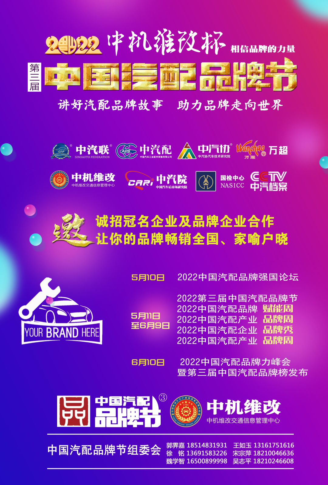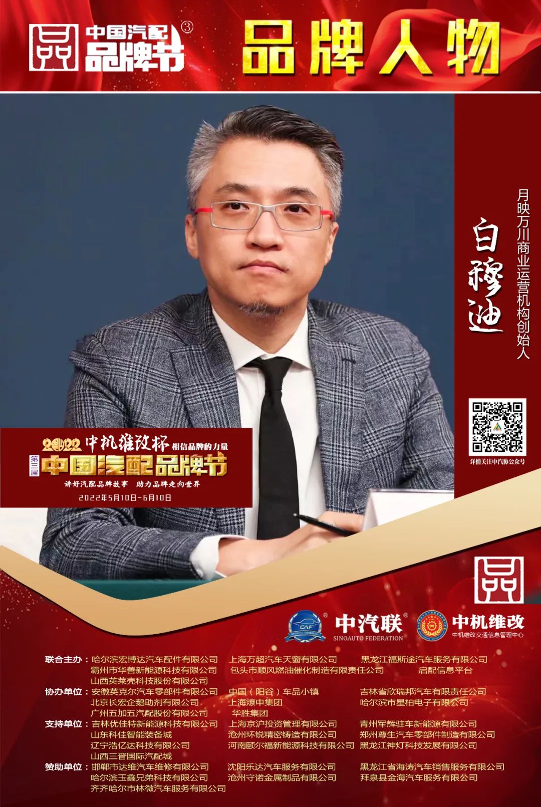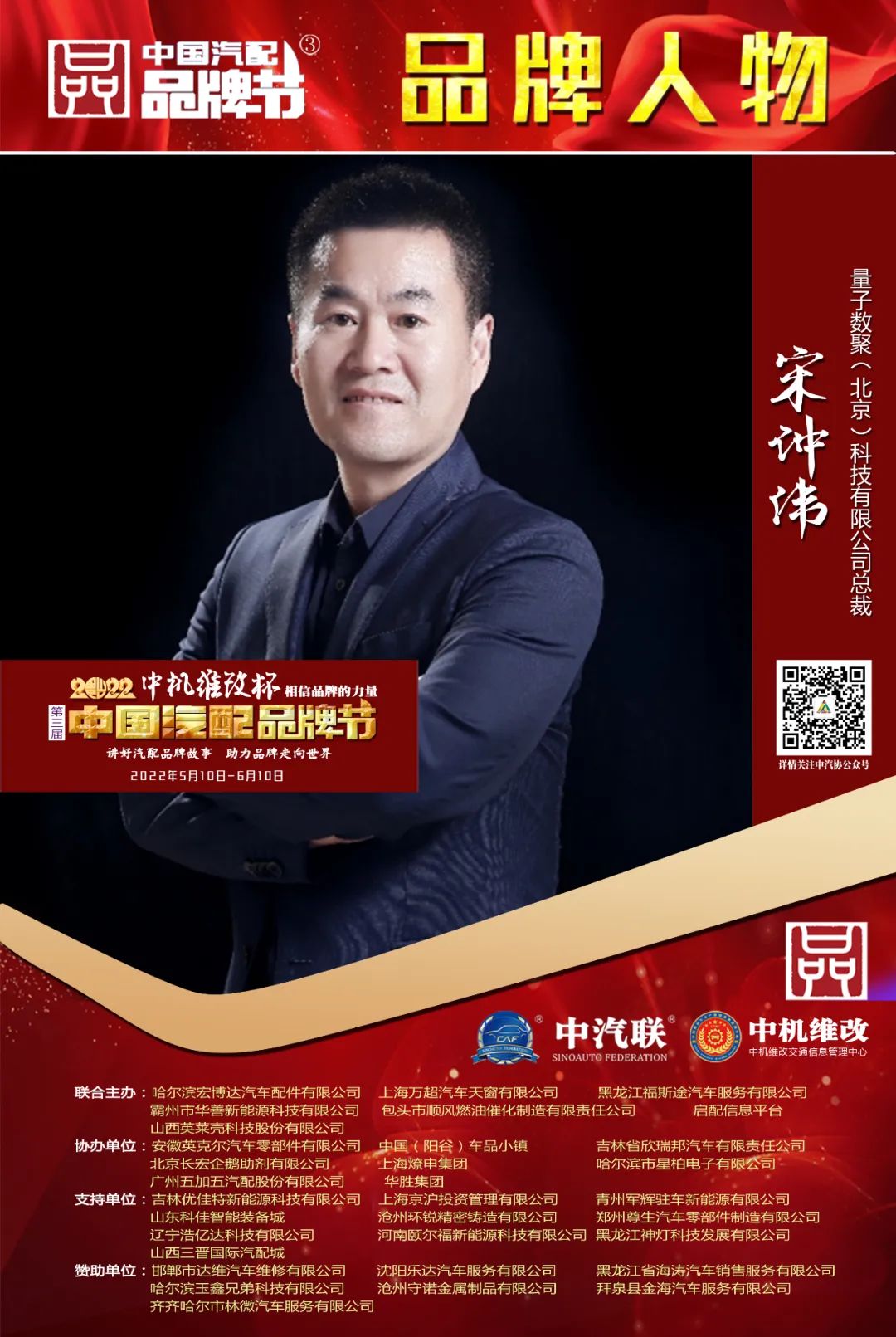 2022中機(jī)維改杯中國汽配品牌節(jié)由中機(jī)維改交通信息管理中心獨(dú)家總冠名,由中汽聯(lián)、中汽配、中機(jī)維改共同主辦;哈爾濱宏博達(dá)汽車配件有限公司、上海萬超汽車天窗有限公司、 黑龍江福斯途汽車服務(wù)有限公司、包頭市順風(fēng)燃油催化器制造有限責(zé)任公司、霸州市華善新能源科技有限公司、啟配信息平臺、山西英萊殼科技股份有限公司聯(lián)合主辦;由中國(陽谷)車品小鎮(zhèn)、華勝集團(tuán)、上海燎申集團(tuán)、吉林欣瑞邦汽車有限責(zé)任公司、安徽英克爾汽車零部件有限公司、北京長宏企鵝助劑有限公司、哈爾濱市星柏電子有限公司、廣州五加五汽配股份有限公司友情協(xié)辦;由吉林優(yōu)佳特新能源科技有限公司、上海京滬投資管理有限公司、青州軍輝駐車新能源有限公司、山東科佳智能裝備城、鄭州尊生汽車零部件制造有限公司、滄州環(huán)銳精密鑄造有限公司、遼寧浩億達(dá)科技有限公司、河南頤爾福新能源科技有限公司、黑龍江神燈科技發(fā)展有限公司、山西三晉國際汽配城、歐神石油化工科技(北京)有限公司、碳立方科技有限公司特別支持;邯鄲市達(dá)維汽車維修有限公司、沈陽樂達(dá)汽車服務(wù)有限公司、黑龍江省海濤汽車銷售服務(wù)有限公司、哈爾濱玉鑫兄弟科技有限公司、滄州守諾金屬制品有限公司、拜泉縣金海汽車服務(wù)有限公司、齊齊哈爾市林微汽車服務(wù)有限公司友情贊助;由德州市鑫雙恒汽車服務(wù)有限公司、浚縣李春亮汽車維修門市部 、滄州春立汽車服務(wù)有限公司、臨沂富裕汽車服務(wù)有限公司、綏中縣宏騰汽車服務(wù)有限公司、榆樹市鑫運(yùn)程汽車服務(wù)限公司、綏中縣鑫發(fā)汽車服務(wù)有限公司、臨清市浩航汽車服務(wù)有限公司、中能國業(yè)(北京)科技有限公司特別祝賀