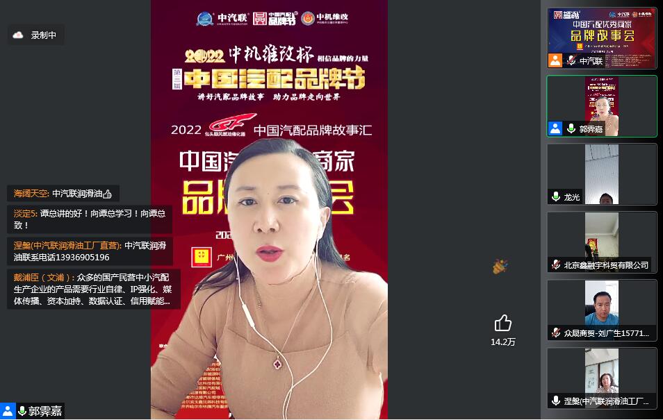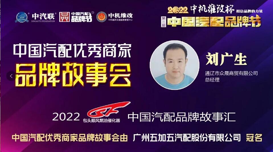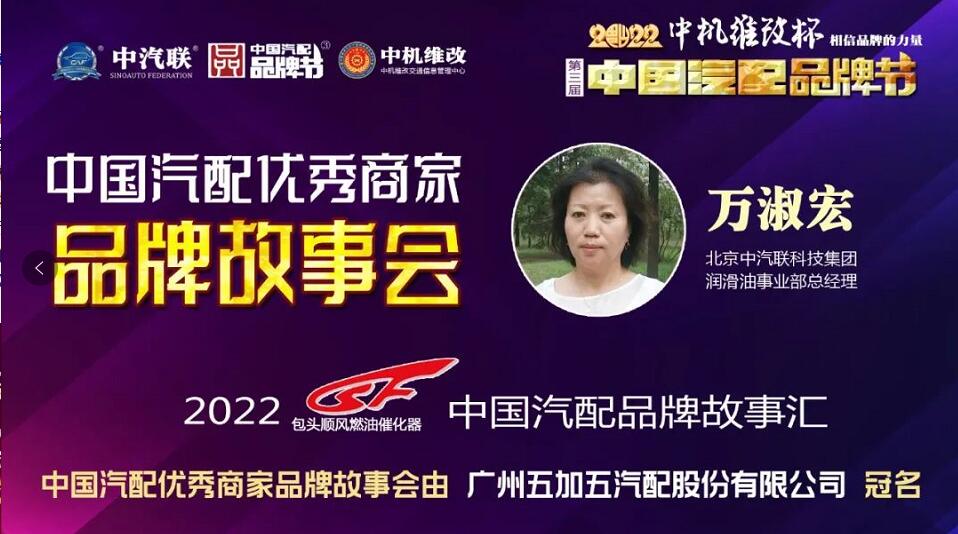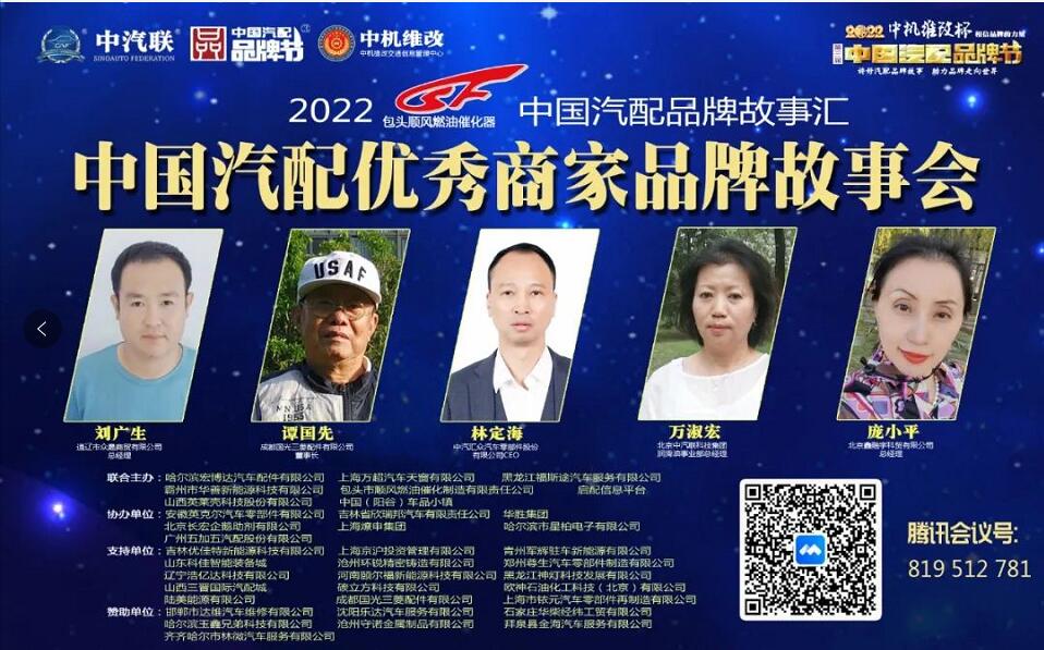 2022年5月24日,“2022 順風燃油催化杯 中國汽配品牌故事匯”的第二場活動,由 廣州五加五汽配股份有限公司 特約冠名播出的“2022中國汽配優(yōu)秀商家品牌故事會在線上成功召開,通遼市眾晟商貿(mào)有限公司總經(jīng)理劉廣生、成都國光三菱配件有限公司董事長譚國先、中汽匯眾汽車零部件股份有限公司CEO 林定海、北京中汽聯(lián)科技集團潤滑油事業(yè)部總經(jīng)理萬淑宏、北京鑫融宇科貿(mào)有限公司總經(jīng)理龐小平 等五位嘉賓做了精彩分享,引起了汽配流通行業(yè)從業(yè)人員的廣泛關(guān)注,點贊達數(shù)量達到150000個。2022中國汽配優(yōu)秀商家品牌故事會由中汽聯(lián)秘書長、中國汽配品牌節(jié)副主席兼秘書長郭霽嘉主持。
