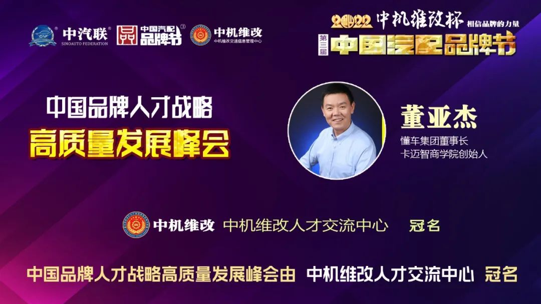 懂車集團董事長、卡邁智商學(xué)院創(chuàng)始人董亞杰 出席2022中國品牌人才戰(zhàn)略高質(zhì)量發(fā)展峰會并作了精彩分享。董總是汽車后市場實體門店連鎖企業(yè)+培訓(xùn)教育第一人,也是汽車后市場唯一一位清華+北大汽車專業(yè)EMBA雙學(xué)歷的企業(yè)家,現(xiàn)任懂車集團董事長,懂車連鎖創(chuàng)始人,卡邁智商學(xué)院創(chuàng)始人、懂車學(xué)院創(chuàng)始人、懂車大學(xué)創(chuàng)始人。