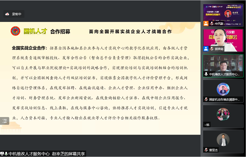 趙主任從國家政策、人才分析、發(fā)展趨勢等角度進行了詮釋,也講解了國家在人才戰(zhàn)略方面的要求。全國職業(yè)技能人才評價教培信息公共服務(wù)平臺是在人社部教育培訓(xùn)中心指導(dǎo)下,由中機維改人才服務(wù)中心負(fù)責(zé)開發(fā)運營的多系統(tǒng)、多應(yīng)用、線上線下相結(jié)合、全方位、多維一體的互聯(lián)互通、信息共享的人才數(shù)字化應(yīng)用管理平臺。他們獲得國家人社部頒發(fā)的《人力資源服務(wù)許可證》和《人力資源服務(wù)備案證》,主要負(fù)責(zé)人力資源供求信息的收集和發(fā)布,就業(yè)和創(chuàng)業(yè)指導(dǎo),人力資源管理咨詢、人力資源測評,人力資源培訓(xùn),人力資源評估,人力資源檔案管理,人力資源服務(wù)外包等專業(yè)服務(wù),根據(jù)國家有關(guān)規(guī)定從事互聯(lián)網(wǎng)人力資源信息服務(wù),針對人才、企業(yè)、院校開展信息互通網(wǎng)絡(luò)公共數(shù)據(jù)匯總與發(fā)布公示工作。他希望下一步行業(yè)人才培訓(xùn)機構(gòu)進行全國聯(lián)動,培養(yǎng)適應(yīng)新四化發(fā)展的實戰(zhàn)人才,為汽車強國夢作出新的貢獻。