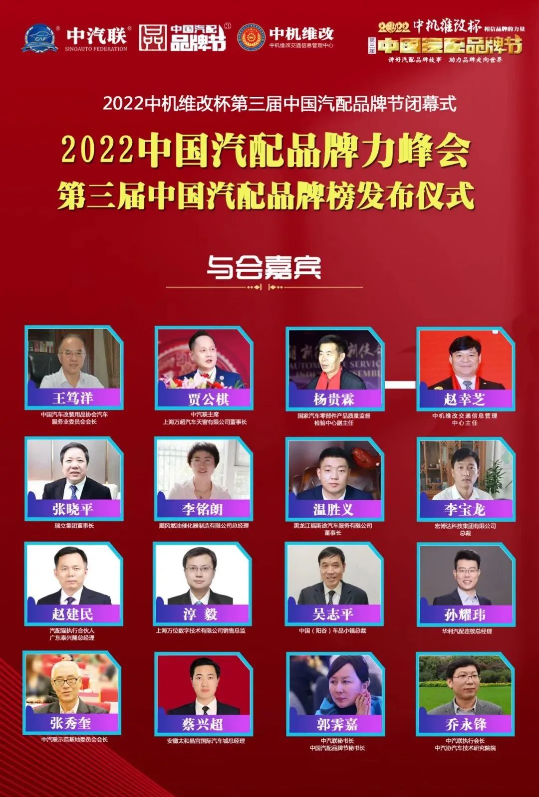 2022年6月10日,為期一個月的2022中機維改杯第三屆中國汽配品牌節(jié)圓滿落幕,中國汽車服務業(yè)委員會會長、中國汽車工業(yè)配件銷售有限公司原董事長王篤洋,中汽聯主席、上海萬超汽車天窗有限公司董事長賈公棋,國家汽車零部件產品質量監(jiān)督檢驗中心副主任、中汽環(huán)球汽配用品檢測認證中心主任楊貴霖,浙江省汽摩配商會會長、瑞立集團董事長張曉平等領導和嘉賓出席閉幕式——“2022中國汽配品牌力峰會暨第三屆中國汽配品牌榜發(fā)布儀式”,引起了行業(yè)的廣泛關注,點贊數量達到124.2萬個。閉幕式由中汽聯執(zhí)行會長、中汽協汽車技術研究院院長喬永鋒主持。