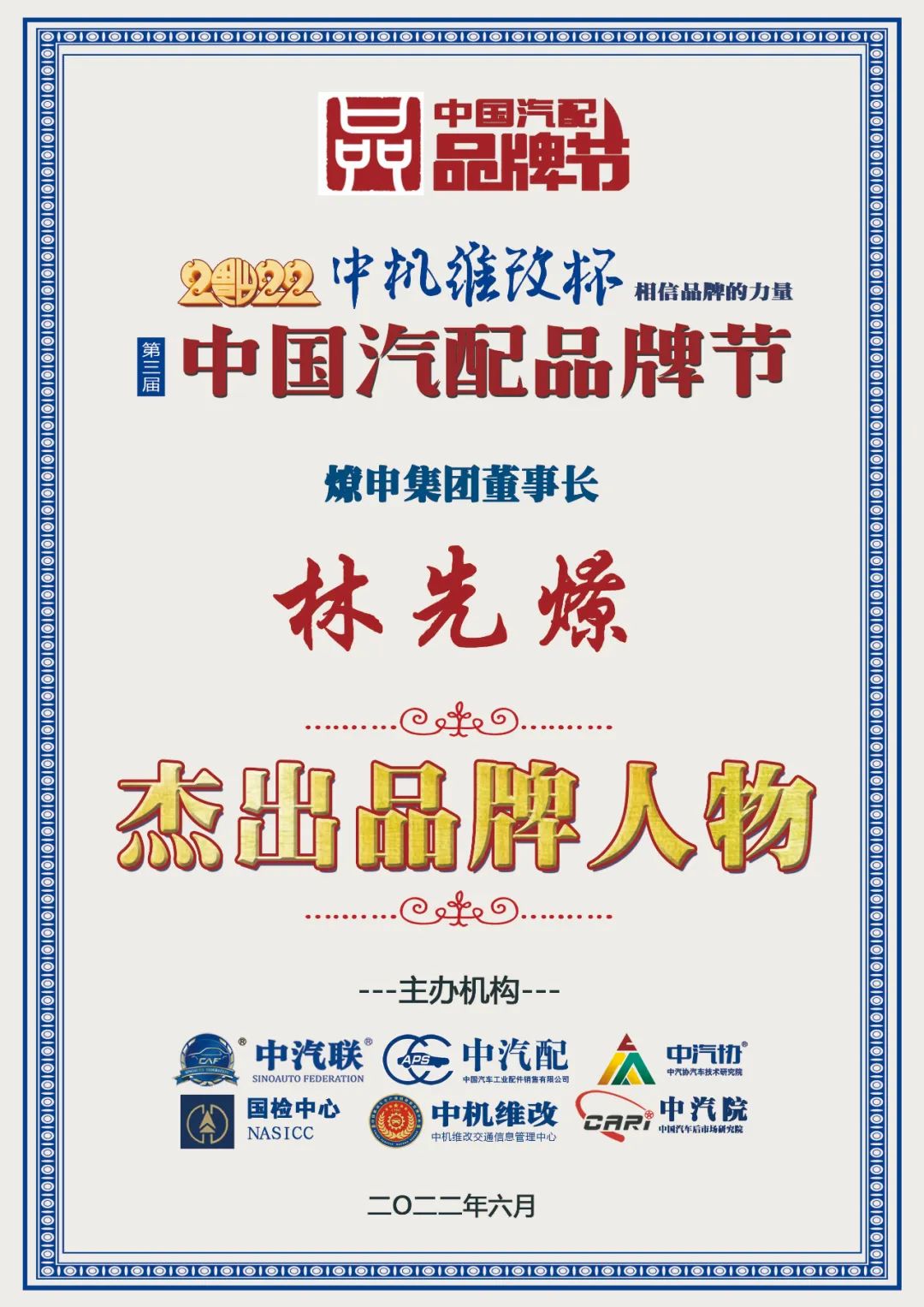 據(jù)《2022中國汽配品牌榜》榜單顯示:燎申集團董事長林先燎榮膺“2022中國汽配行業(yè)杰出品牌人物”、燎申集團榮膺“中國汽配行業(yè)杰出品牌企業(yè)”兩項大獎。