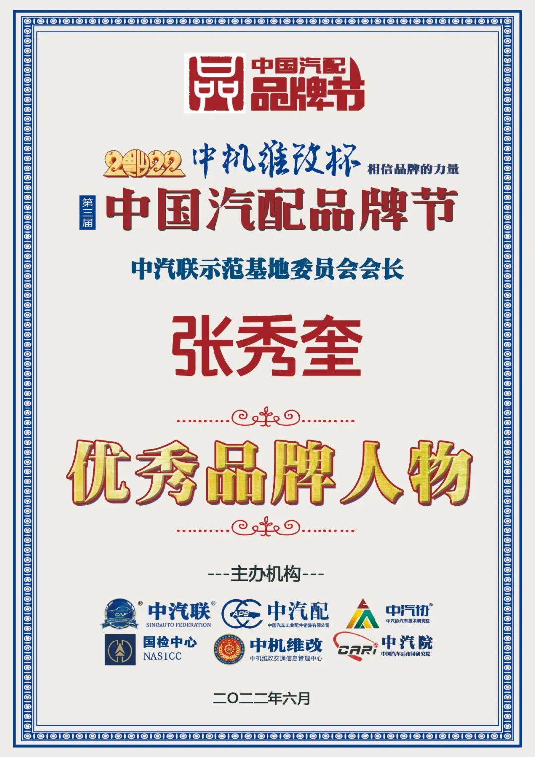 據(jù)《2022中國汽配品牌榜》榜單顯示:中汽聯(lián)示范基地委員會會長張秀奎榮膺“2022中國汽配行業(yè)優(yōu)秀品牌人物”大獎