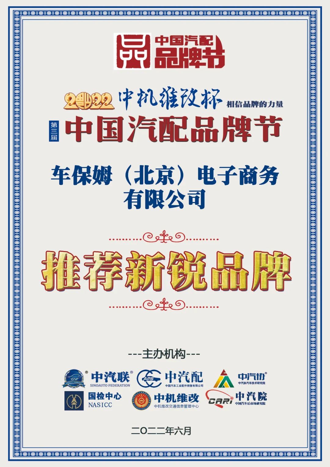 據(jù)《2022中國汽配品牌榜》榜單顯示:車保姆汽配推廣榮膺“2022中國汽配推薦新銳品牌”大獎。
