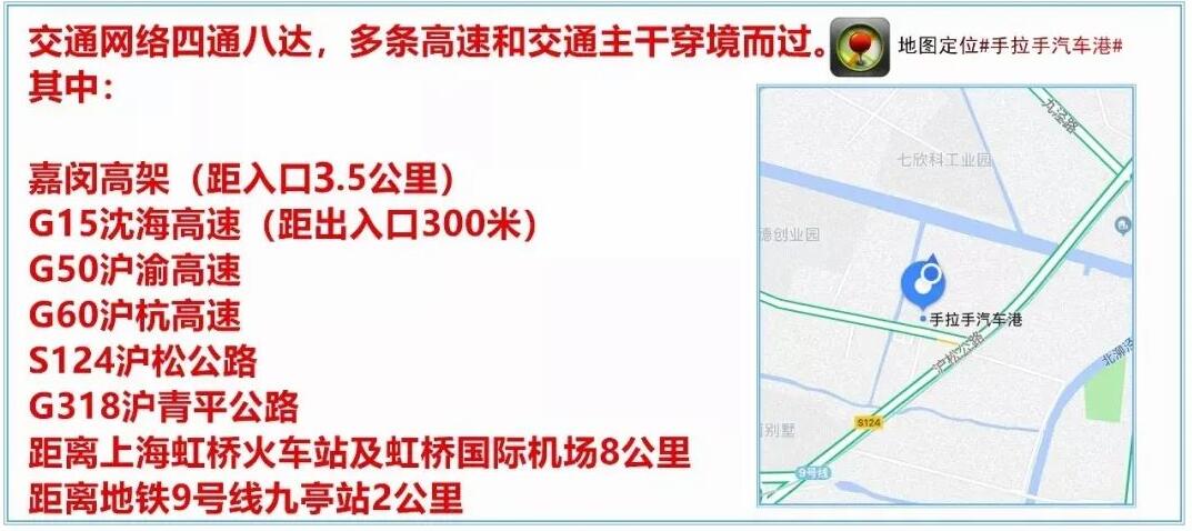 手拉手汽車港位于上海市松江區(qū)泗涇鎮(zhèn)九干路50號(hào)(滬松公路口),地鐵9號(hào)線貫穿而過,夜間乘坐9號(hào)線可以欣賞到我們園區(qū)美美的燈光秀哦!