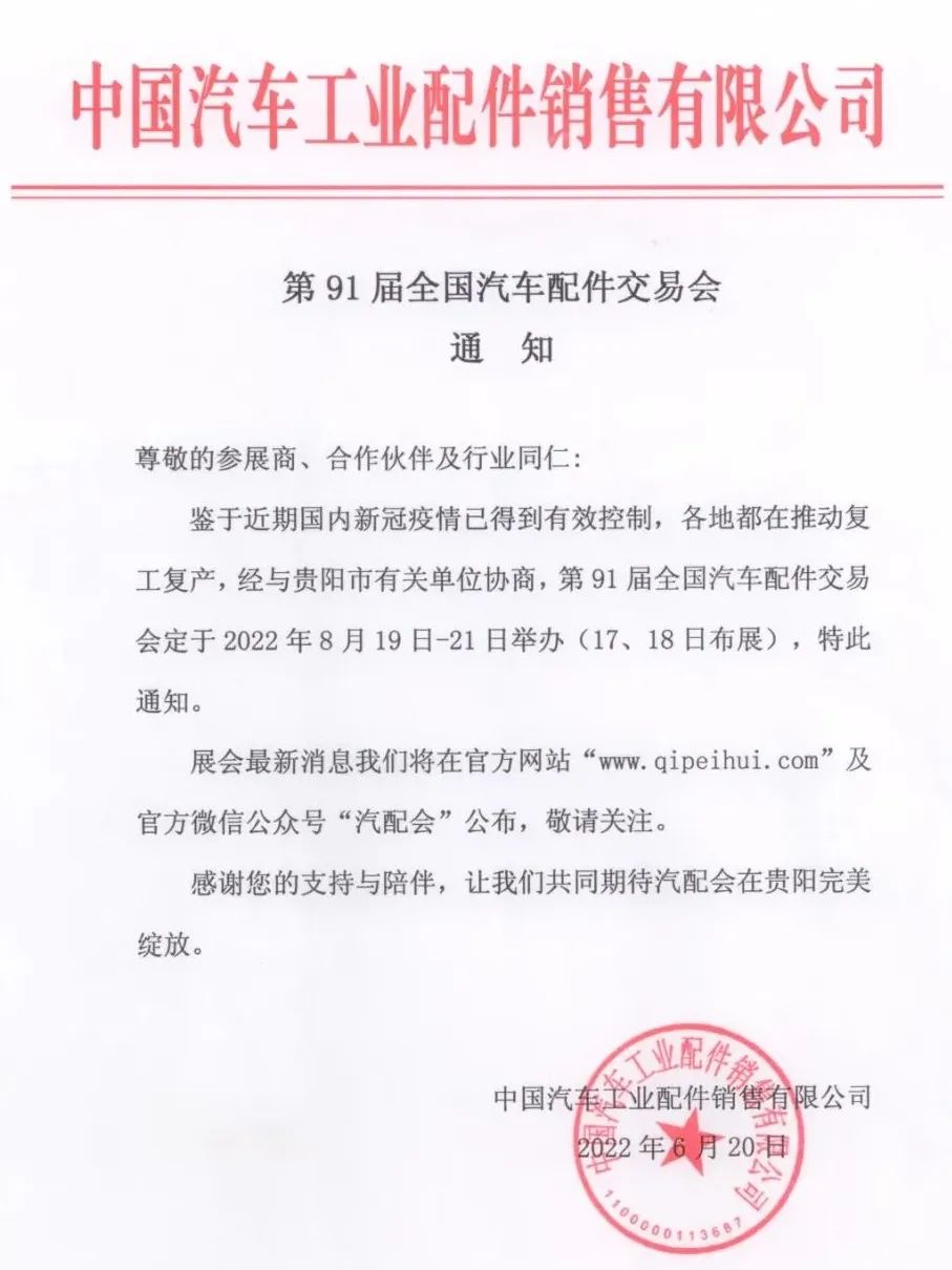 根據(jù)中國汽車工業(yè)配件銷售有限公司的展會(huì)安排,第91屆全國汽車配件交易會(huì)定于2022年8月19日--21日在貴陽國際會(huì)展中心舉行,歡迎全國展商踴躍參展,共襄盛舉。