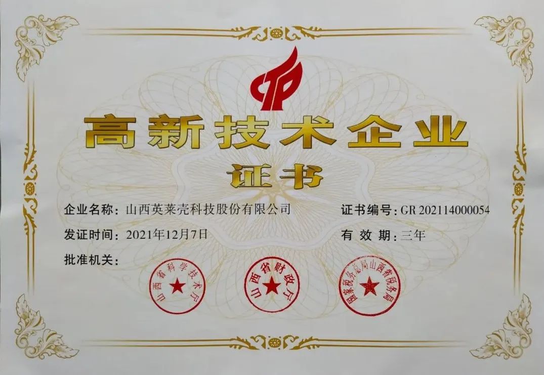 依據(jù)科技部、財(cái)政部、國家稅務(wù)總局《高新技術(shù)企業(yè)認(rèn)定管理辦法》、《高新技術(shù)企業(yè)認(rèn)定管理工作指引》的規(guī)定,山西省科學(xué)技術(shù)廳、山西省財(cái)政廳、省國稅局經(jīng)組織專家評(píng)審,通過嚴(yán)格的層層審查,英萊殼憑借過硬的研發(fā)實(shí)力和創(chuàng)新能力,一舉通過國家級(jí)《高新技術(shù)企業(yè)證書》的認(rèn)定!