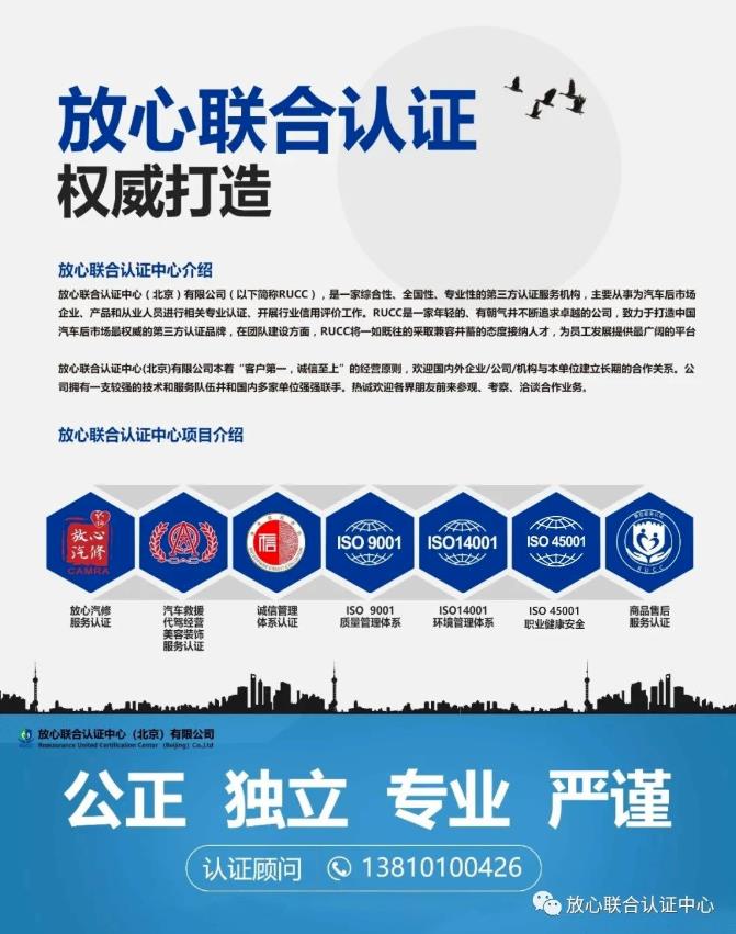 放心聯(lián)合認(rèn)證中心(北京)有限公司是經(jīng)國家認(rèn)證認(rèn)可監(jiān)督管理委員會(huì)批準(zhǔn),在北京工商行政管理局注冊(cè)的企業(yè)法人,本中心成立于2016年。是國內(nèi)最早批準(zhǔn)具有服務(wù)認(rèn)證資質(zhì)的第三方認(rèn)證機(jī)構(gòu) 。其“放心汽修”服務(wù)認(rèn)證在國內(nèi)具有權(quán)威性。