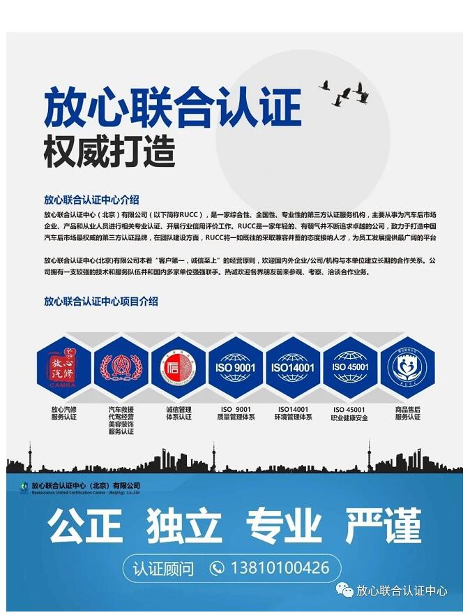 放心聯(lián)合認證中心(北京)有限公司是經(jīng)國家認證認可監(jiān)督管理委員會批準,在北京工商行政管理局注冊的企業(yè)法人,本中心成立于2016年。是國內(nèi)最早批準具有服務認證資質(zhì)的第三方認證機構(gòu) 。其“放心汽修”服務認證在國內(nèi)具有權威性。