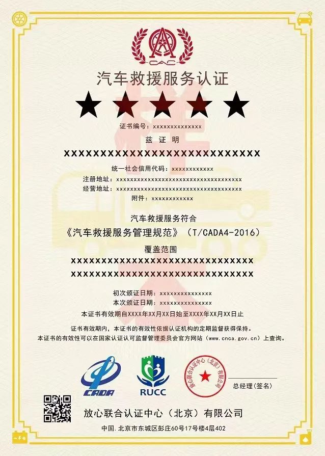 汽車(chē)救援服務(wù)認(rèn)證證書(shū)式樣