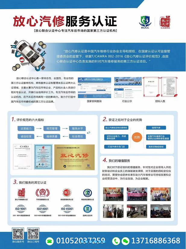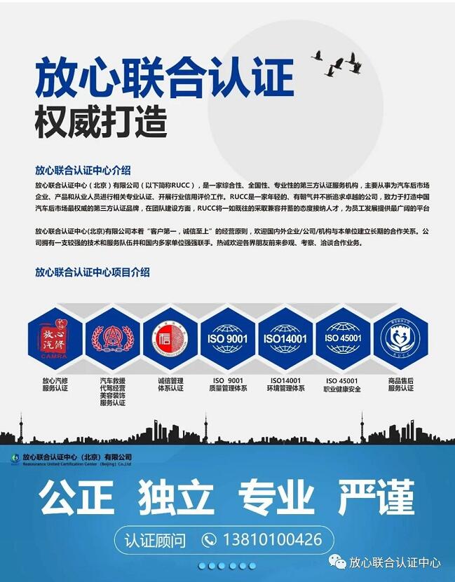 放心聯(lián)合認(rèn)證中心(北京)有限公司是經(jīng)國(guó)家認(rèn)證認(rèn)可監(jiān)督管理委員會(huì)批準(zhǔn),在北京工商行政管理局注冊(cè)的企業(yè)法人,本中心成立于2016年。是國(guó)內(nèi)最早批準(zhǔn)具有服務(wù)認(rèn)證資質(zhì)的第三方認(rèn)證機(jī)構(gòu) 。其“放心汽修”服務(wù)認(rèn)證在國(guó)內(nèi)具有權(quán)威性。