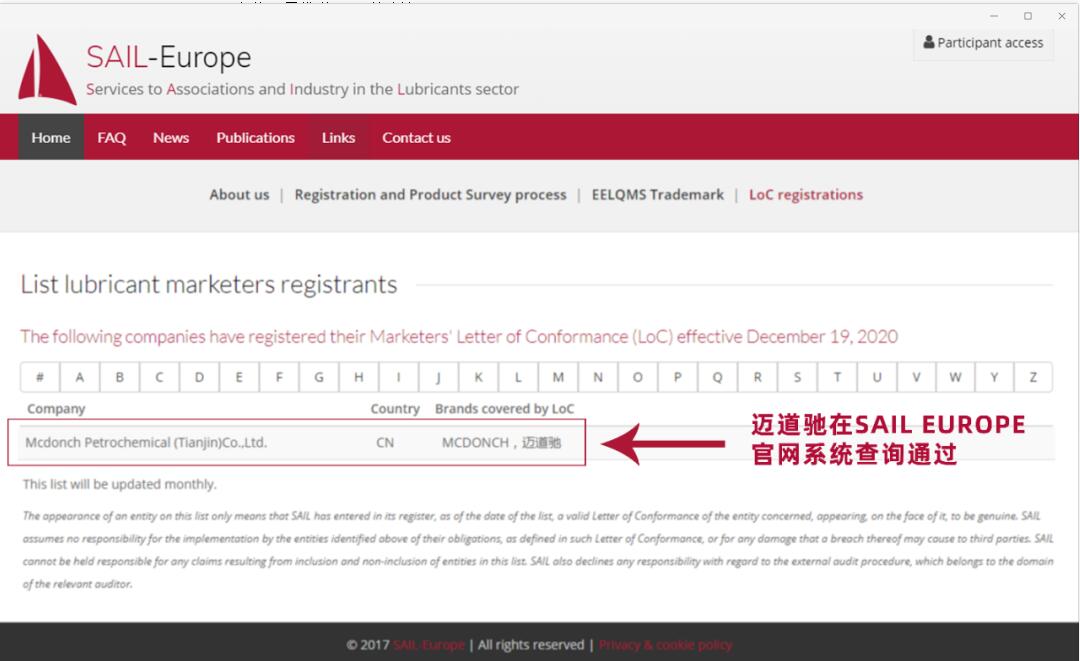 邁道馳在SAIL EUROPE官網(wǎng)系統(tǒng)查詢通過: