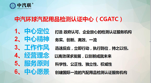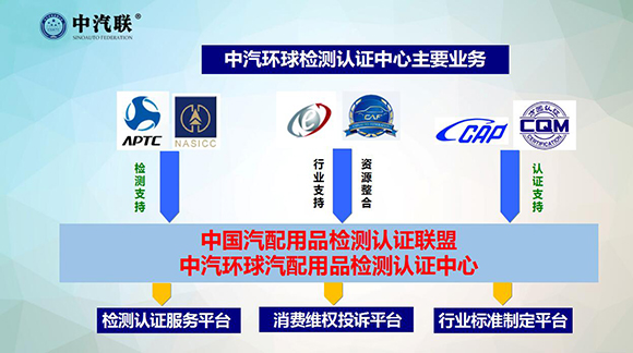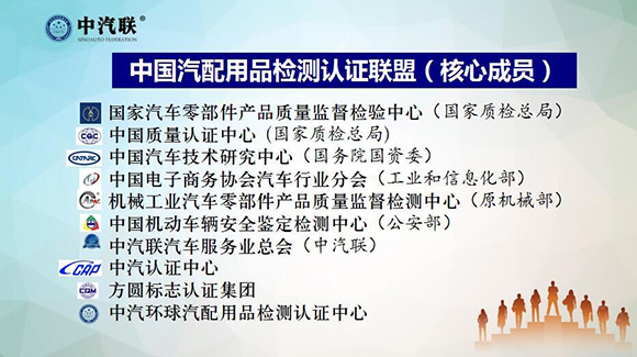 中汽聯(lián)攜手國家權(quán)威檢測認(rèn)證機(jī)構(gòu)——國家汽車零部件產(chǎn)品質(zhì)量監(jiān)督檢驗中心、機(jī)械工業(yè)汽車零部件產(chǎn)品質(zhì)量監(jiān)督檢測中心、中汽認(rèn)證中心、方圓標(biāo)志認(rèn)證集團(tuán)等共同打造專業(yè)檢測認(rèn)證領(lǐng)域的服務(wù)機(jī)構(gòu) “中汽環(huán)球汽配用品檢測認(rèn)證中心”及“中國汽配用品檢測認(rèn)證聯(lián)盟” 。
