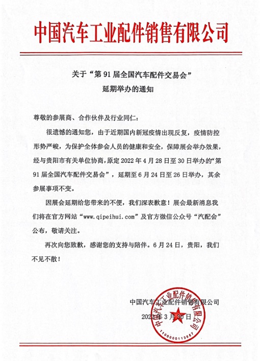 受疫情影響,第91屆全國汽車配件交易會延期至2022年6月24日-26日舉辦,特此通知。因展會延期給您帶來不便,我們深表歉意,感謝您的支持與陪伴!