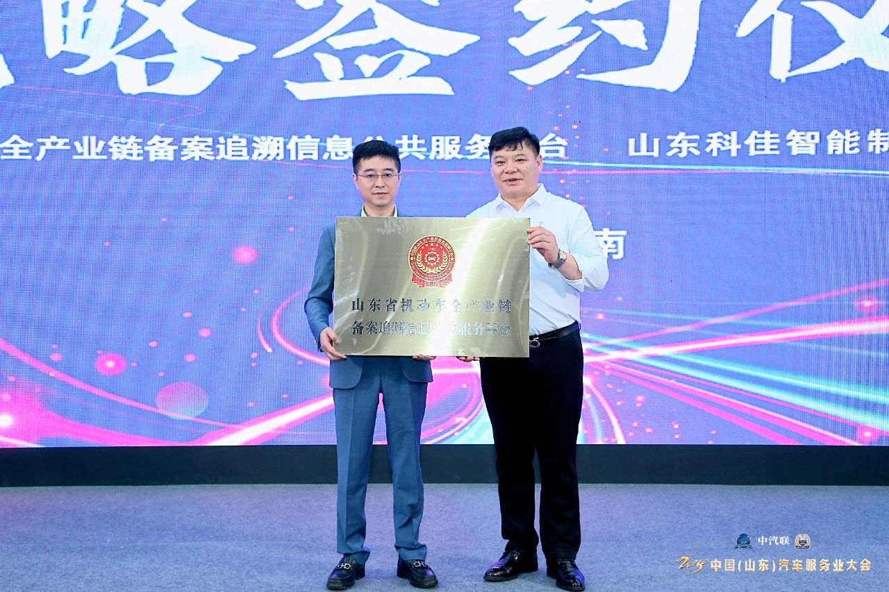 在中國(guó)汽車(chē)工業(yè)委員會(huì)會(huì)長(zhǎng)王篤洋,濟(jì)南新材料產(chǎn)業(yè)園區(qū)管委會(huì)主任韓利師,濟(jì)南市天橋區(qū)副區(qū)長(zhǎng)劉志華,濟(jì)南新材料產(chǎn)業(yè)園區(qū)管委會(huì)副主任張良通,濟(jì)南新材料產(chǎn)業(yè)園區(qū)管委會(huì)副主任于業(yè)輝等領(lǐng)導(dǎo)的見(jiàn)證下,中國(guó)機(jī)動(dòng)車(chē)全產(chǎn)業(yè)鏈備案追溯中心主任趙幸芝與山東科佳智能制造集團(tuán)有限公司董事長(zhǎng)方子盛簽訂戰(zhàn)略合作協(xié)議。