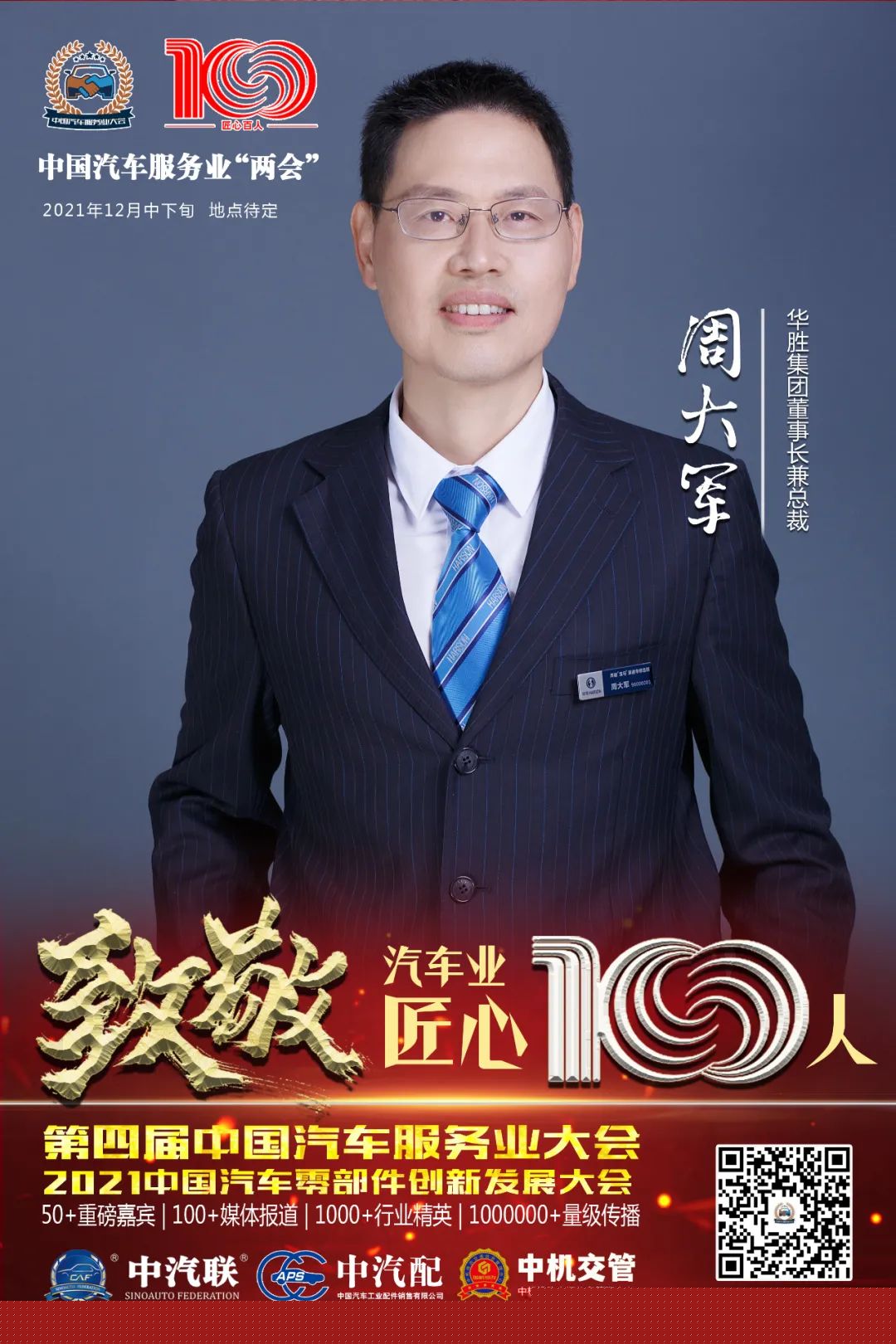 據(jù)第四屆中國汽車服務(wù)業(yè)大會組委會介紹,中汽聯(lián)主席團主席、華勝集團總裁兼董事長周大軍入選“百年百人”中國汽車業(yè)匠心100人。