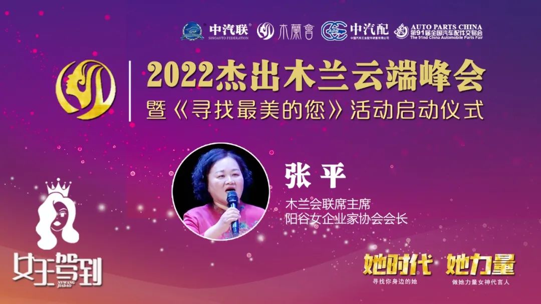很榮幸參加2022杰出木蘭云端峰會(huì)暨《尋找最美的您》系列活動(dòng)啟動(dòng)儀式!我來自打虎英雄武松的故鄉(xiāng)——山東陽(yáng)谷縣,我是陽(yáng)谷車品創(chuàng)始人、陽(yáng)谷縣女企業(yè)家協(xié)會(huì)會(huì)長(zhǎng)、陽(yáng)谷汽車用品行業(yè)協(xié)會(huì)會(huì)長(zhǎng)張平!