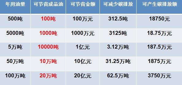 按照使用金聖節(jié)能環(huán)保燃油后可增加燃油利用效率20%,按照每噸成品油批發(fā)價(jià)10000元,根據(jù)我國(guó)目前碳交易價(jià)格均價(jià)每噸60元進(jìn)行推算: