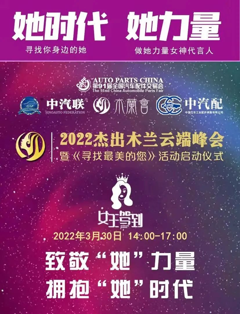 據(jù)悉,讓我們6月24-26日相聚貴陽第91屆全國汽車配件交易會(huì),共同舉辦2022第四屆中國木蘭盛會(huì)暨最美木蘭奮斗者峰會(huì)。木蘭會(huì)將于4月8-15日在全國范圍內(nèi)“尋找你身邊的她——做她力量女神代言人”網(wǎng)絡(luò)征選活動(dòng),4月中下旬將在全國范圍內(nèi)尋找“最美木蘭紅旗手”、“最美木蘭奮斗者”、“最美木蘭新領(lǐng)袖”、“最美巾幗英雄”等杰出木蘭人物,屆時(shí)將在第四屆中國木蘭盛會(huì)上盛大揭曉,致敬她力量、擁抱她時(shí)代,做杰出木蘭,無愧于新時(shí)代!