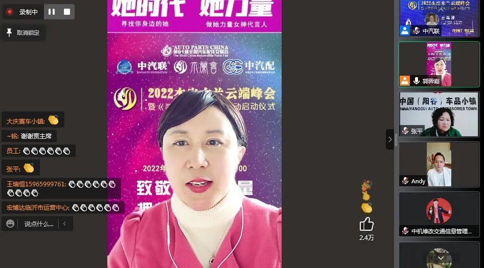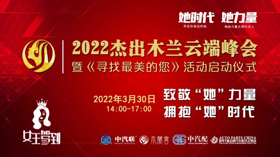 2022年3月30日,“致敬‘她’力量 擁抱‘她’時(shí)代”為主題的“2022杰出木蘭云端峰會(huì)暨《尋找最美的您》系列活動(dòng)啟動(dòng)儀式”在線上成功舉辦。本次峰會(huì)由第91屆全國汽車配件交易會(huì)特別支持,中汽聯(lián)、木蘭會(huì)、中國汽車工業(yè)配件銷售有限公司主辦。峰會(huì)聚焦當(dāng)代女性價(jià)值觀理念,探討如何在生機(jī)與挑戰(zhàn)共存、創(chuàng)新與奮斗并進(jìn)的時(shí)代,克服困難突破局限,激發(fā)內(nèi)心力量,綻放女性光芒等社會(huì)關(guān)注話題,全面剖析木蘭創(chuàng)業(yè)心路歷程,再現(xiàn)木蘭在推動(dòng)企業(yè)創(chuàng)新發(fā)展過程中舉足輕重的力量,以奔跑奮進(jìn)的姿態(tài),譜寫木蘭“半邊天”的壯麗詩篇,以特殊的方式迎接黨的二十大勝利召開,助推中國汽車產(chǎn)業(yè)高質(zhì)量發(fā)展!